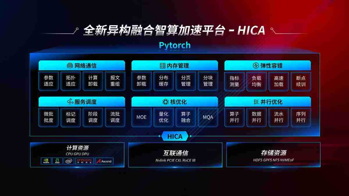 通过自研的服务层、、中间适配层、、、、以及调度编排算法,,,,采用数据并行、、模型并行等多种并行方式,,,把并行计算任务进行有效的分解,,使其分别由相应的软件栈和算力资源来承接。。。当GPU资源变化,,HICA可以实时动态调度计算子任务并调整模型拓扑和架构,,以充分聚合各种算力资源。。。